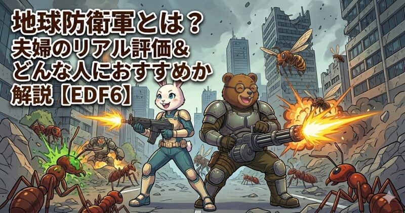20年ゲームをやってきたけど、EDF6は協力ゲームとして完成度が高いと思う。敵の量・武器の種類・難易度の幅、どれも丁寧に作られてる。ウサさんみたいな初心者でも楽しめるし、インフェルノ難易度はベテランでも歯ごたえ十分。夫婦で一緒に遊ぶなら、これ以上ない選択肢のひとつだよ。🐻